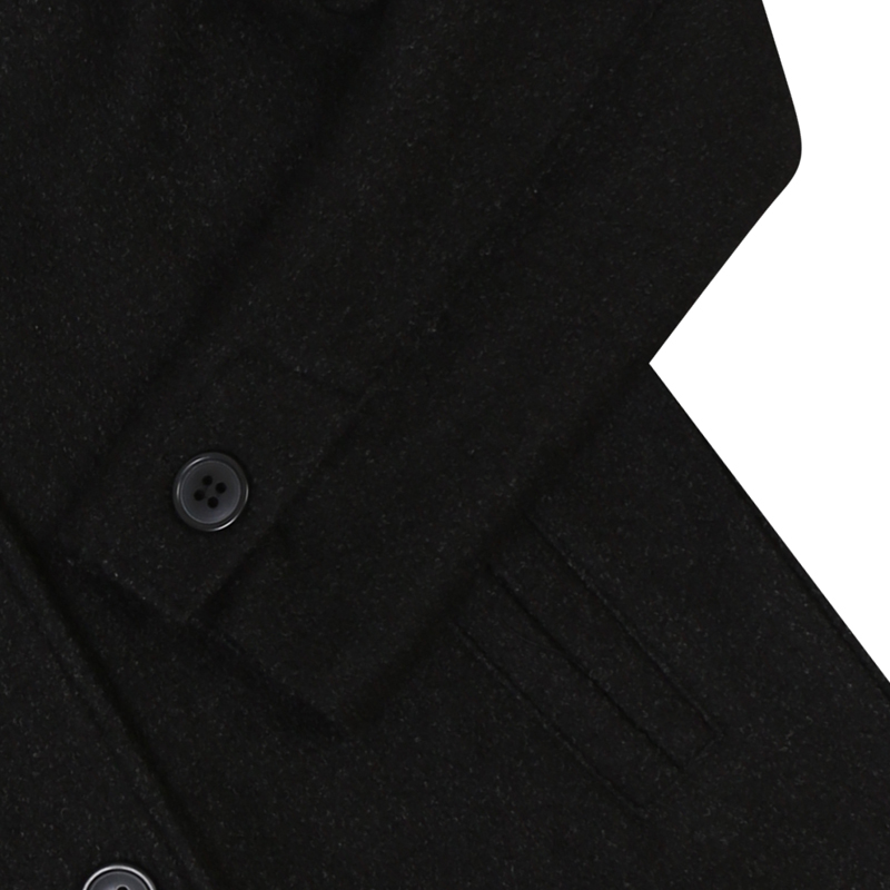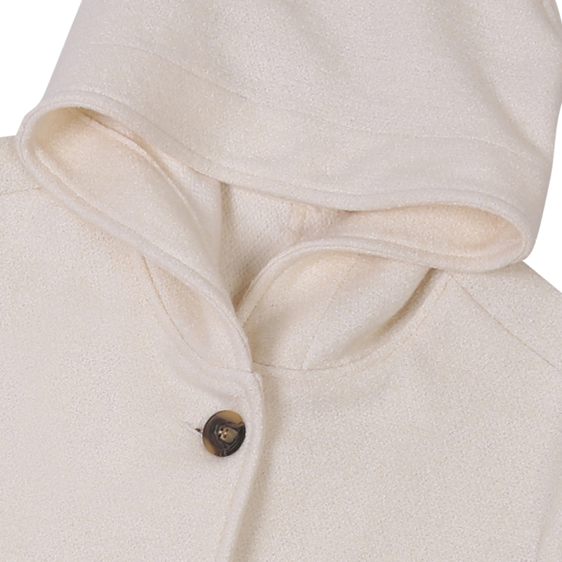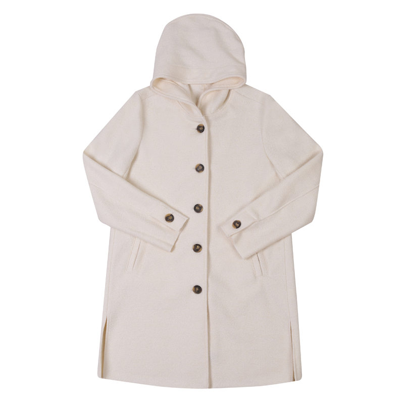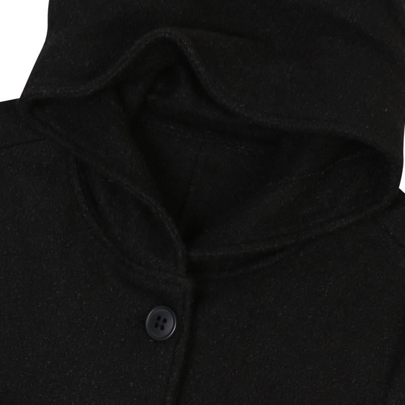 Hooded wool-blend coat with button closure and two front slash pockets. Back length: 87 cm.
