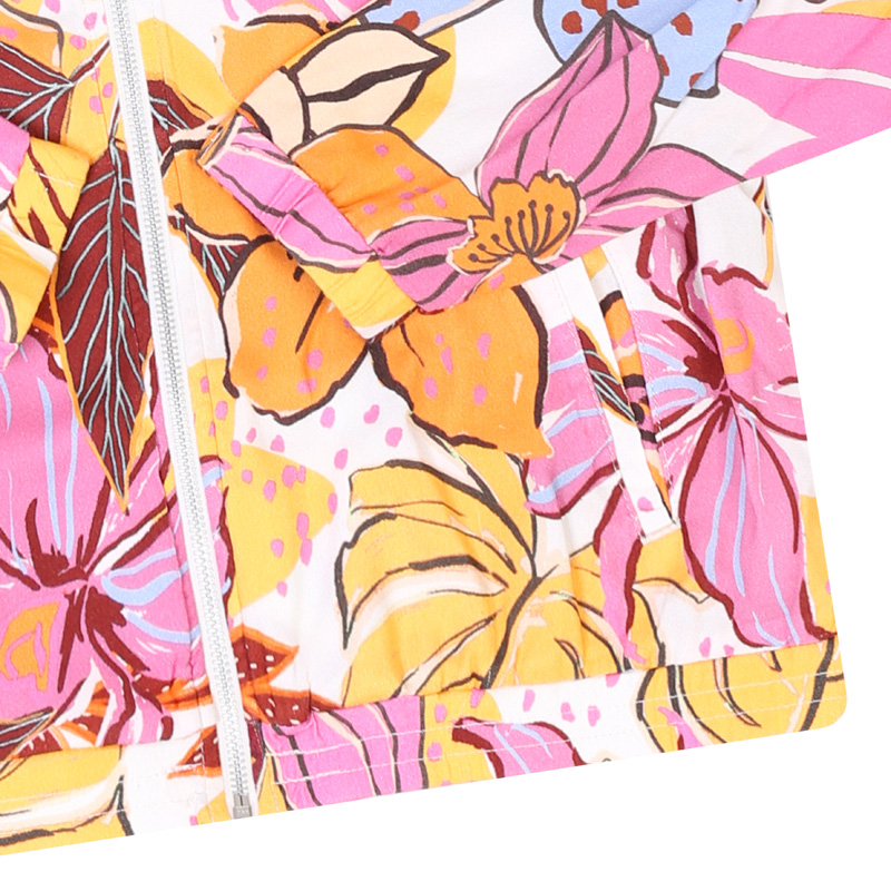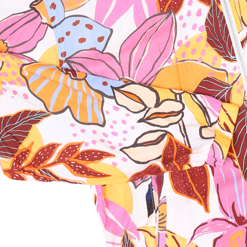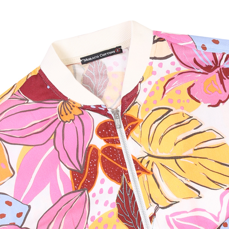 Printed zip-up jacket with two front slash pockets elastic hand cuffs and waistband and a ribbed collar. Made from viscose for a lightweight and flowy look. Back Length: 64 cm