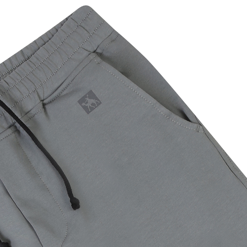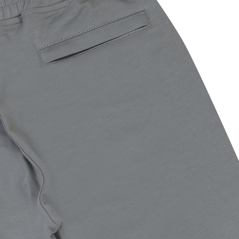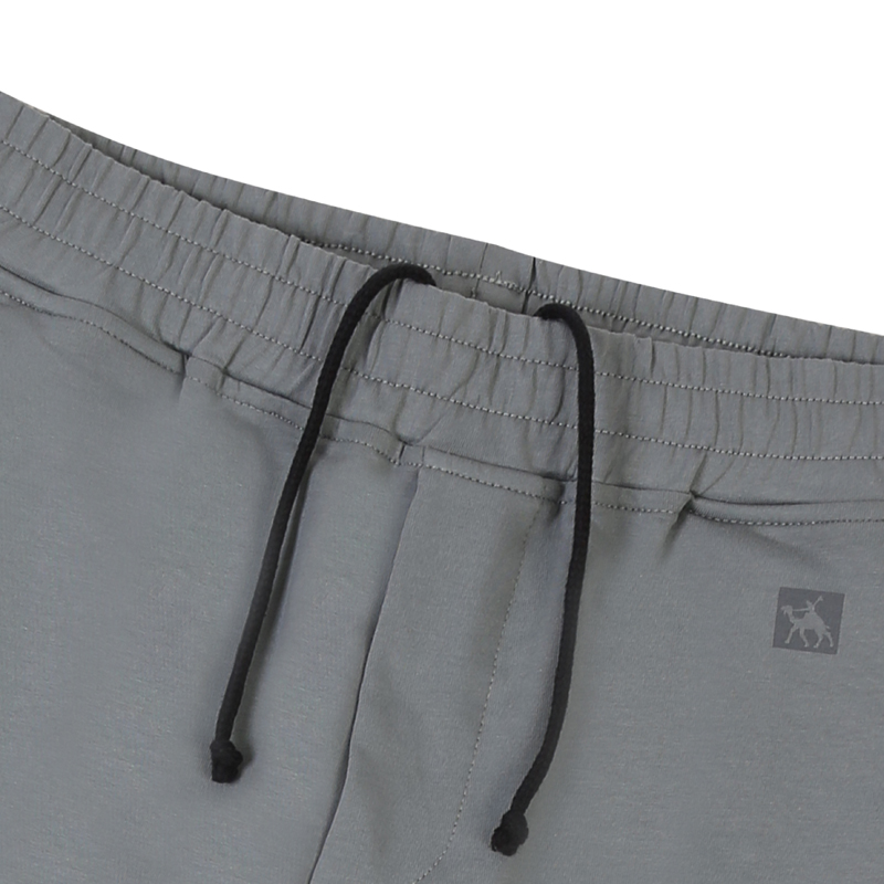 Stretch french terry sweatpants with back zip pocket, two front slash pockets, elastic hems, and elastic waist with adjustable drawstring